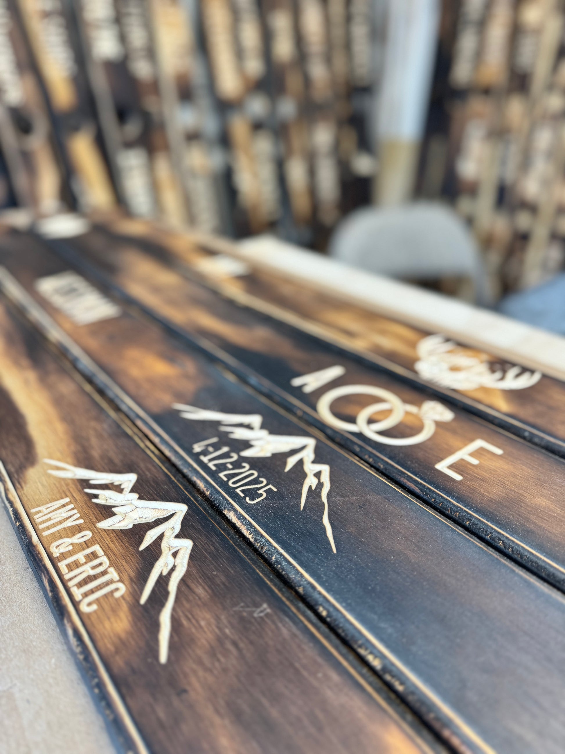 This 65" two-piece design is completely handmade, blowtorched, engraved, and finished to the same high-end standard as our signature skis. Every ski is fully customizableānames, dates, logos, mountains, coordinates, or anything meaningful to your celebration.